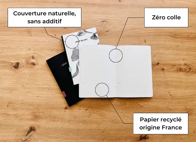 Nous travaillons avec des papiers recyclés origine France 🇫🇷 (sauf la couverture du Carnet Noir, origine Italie) et des procédés de fabrication qui réduisent au maximum l’empreinte environnemental de chaque carnet.